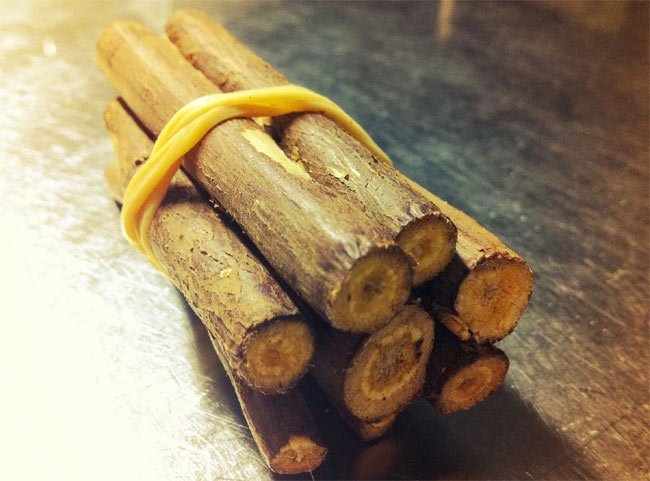 Esta "Golosina" con nombre científico ilegible (Glycyrrhiza glabra) resulta ser la raíz de una planta de la familia de las leguminosas (Fabáceas) y no es ni más ni menos que el famoso regaliz de siempre.